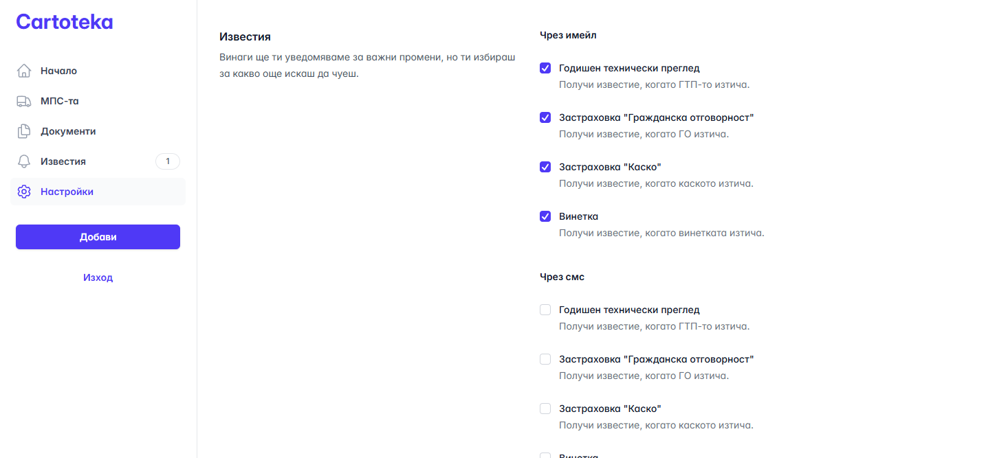 - Ще получаваш ивестия за изтичащ годишен технически преглед, застраховки "Гражданска отговорност", "Каско" или винетка посредством имейл.